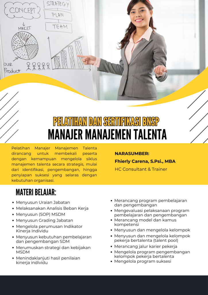Pelatihan ini dirancang untuk memperkuat peran Manajer Manajemen Talenta dalam membangun dan mengendalikan sistem talenta organisasi secara terintegrasi. Fokus pelatihan tidak hanya pada pengelolaan individu, tetapi pada bagaimana talenta dipetakan, dikembangkan, dan dipersiapkan secara sistematis untuk mendukung kinerja dan keberlanjutan organisasi.