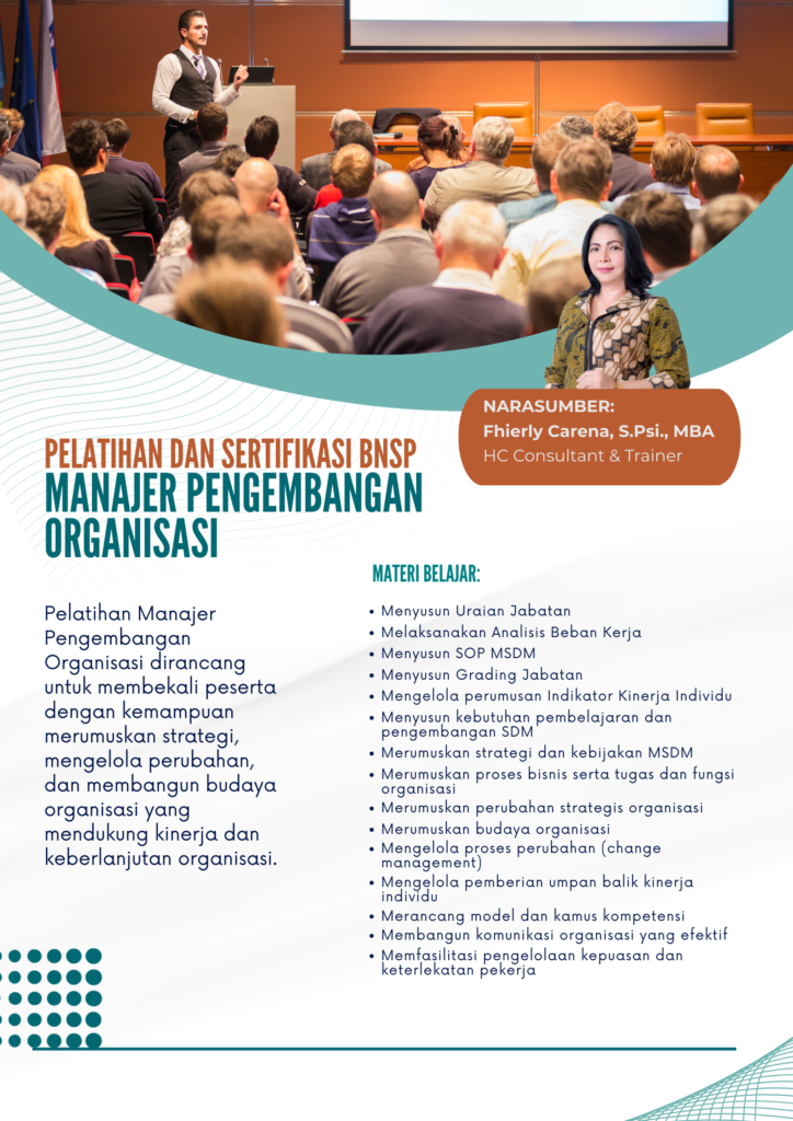 Pelatihan ini dirancang untuk memperkuat peran Manajer Pengembangan Organisasi dalam merancang dan mengendalikan pengembangan organisasi secara strategis, selaras dengan arah bisnis, dinamika perubahan, dan kebutuhan jangka panjang organisasi. Fokus pelatihan diarahkan pada penciptaan organisasi yang adaptif, efektif, dan berdaya saing.