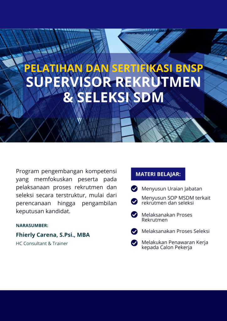 Pelatihan ini dirancang untuk menyiapkan peserta agar mampu mengendalikan proses rekrutmen dan seleksi secara profesional di level supervisor, mulai dari perencanaan kebutuhan hingga penetapan kandidat yang tepat. Fokus pelatihan bukan sekadar menjalankan tahapan, tetapi menghasilkan keputusan rekrutmen yang objektif dan dapat dipertanggungjawabkan kepada manajemen.